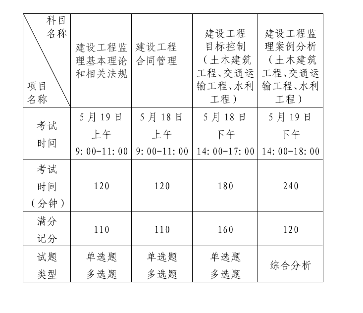 监理工程师职业资格考试设《建设工程监理基本理论和相关法规》(客观题)、《建设工程合同管理》(客观题)、《建设工程目标控制》(客观题)和《建设工程监理案例分析》(主观题)4个科目。其中《建设工程监理基本理论和相关法规》和《建设工程合同管理》为基础科目;《建设工程目标控制》和《建设工程监理案例分析》为专业科目。专业类别分为土木建筑工程、交通运输工程和水利工程,报考人员可根据实际工作需要选报其一。监理工程师职业资格考试成绩实行4年为一个周期的滚动管理办法,参加4个科目考试(级别为考全科)的人员须在连续4个考试年度内通过全部应试科目,参加2个科目考试(级别为免二科)的符合免试基础科目人员须在连续2个考试年度内通过相应应试科目,方可获得资格证书。已取得监理工程师一种专业职业资格证书的人员,报名参加其他专业科目考试的(级别为增报专业),可免考基础科目,在连续2个考试年度内通过相应应试科目,可获得相应专业考试合格证明,该证明作为注册时增加执业专业类别的依据。